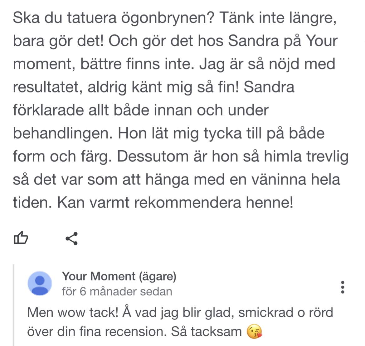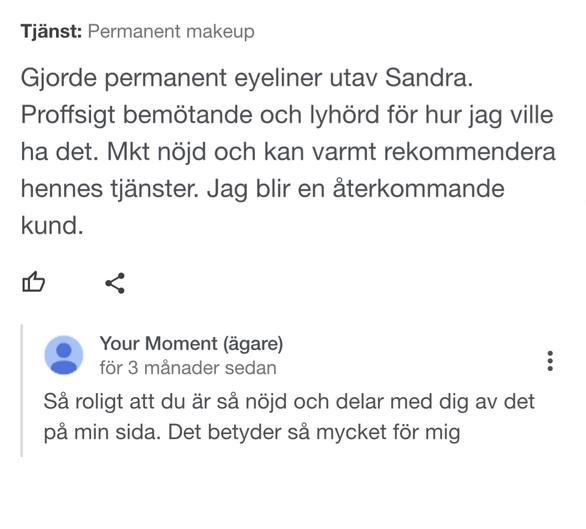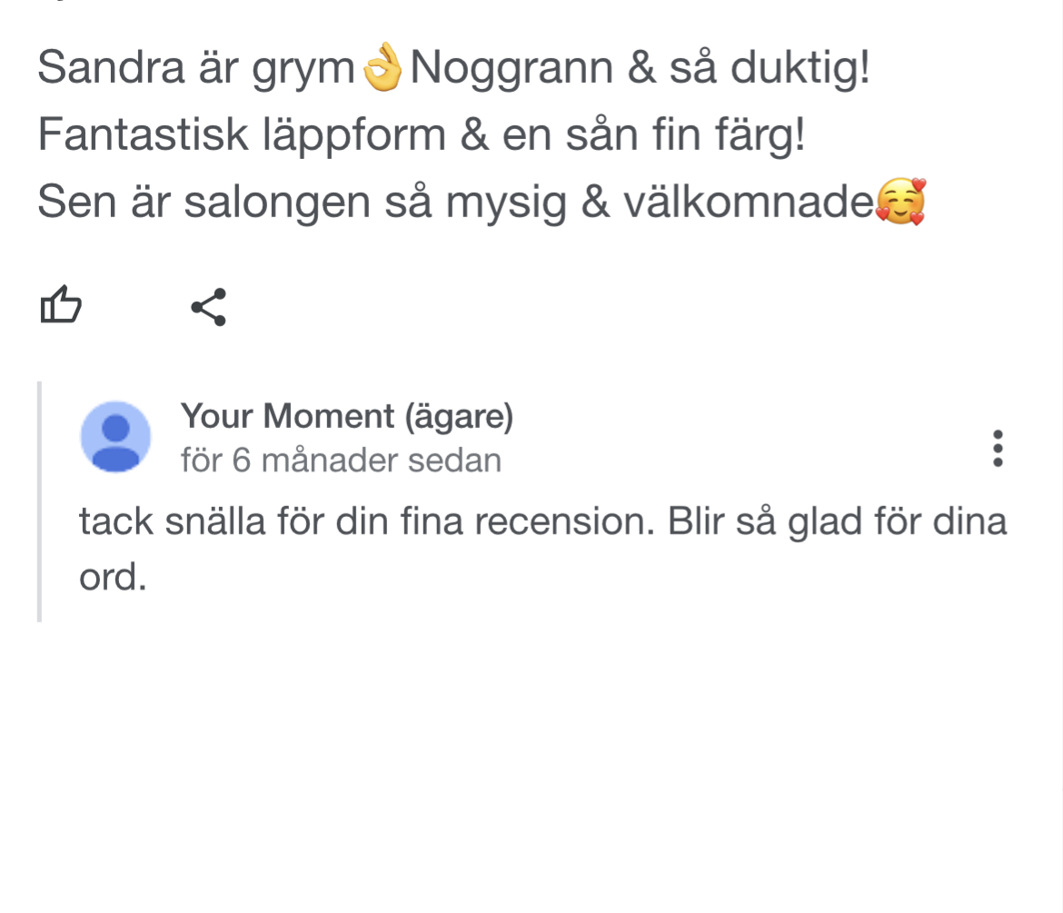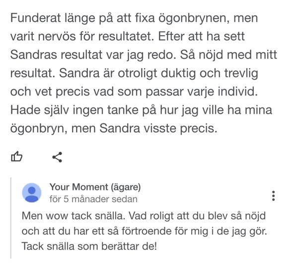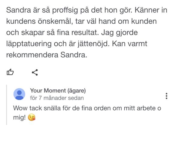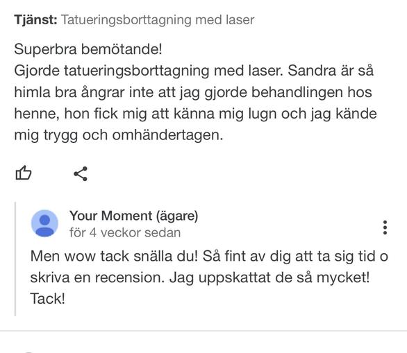 Det betyder så mycket för mig att ni lämnar recensioner om hur ni upplevde ert besök och behandling hos mig. Nedan kan du själv lämna en recension men också ta del av vad andra uppskattar med mig.